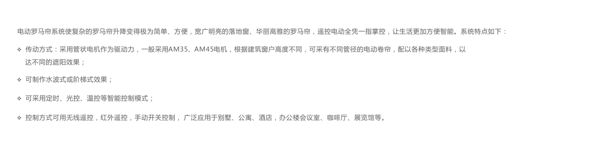 電動羅馬簾的歐洲古典風(fēng)格,和有褶皺的層次,給人以雍容華貴的感覺;她具有遮陽、隔熱、防塵、透風(fēng)、舒適、涼爽等優(yōu)點。